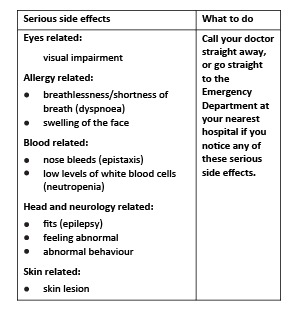 During treatment, you or your child may be at risk of developing certain side effects. It is important you understand these risks and how to monitor for them. See additional information under Section 6. Are there any side effects?