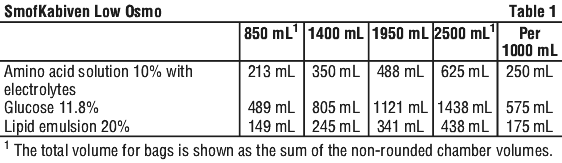 SmofKabiven Low Osmo comes in a 3-chamber plastic bag, each chamber contains glucose, amino acids with electrolytes and a lipid emulsion separately. The glucose and amino acid solutions are clear, colourless or slightly yellow and free from particles. The lipid emulsion is white and homogeneous.