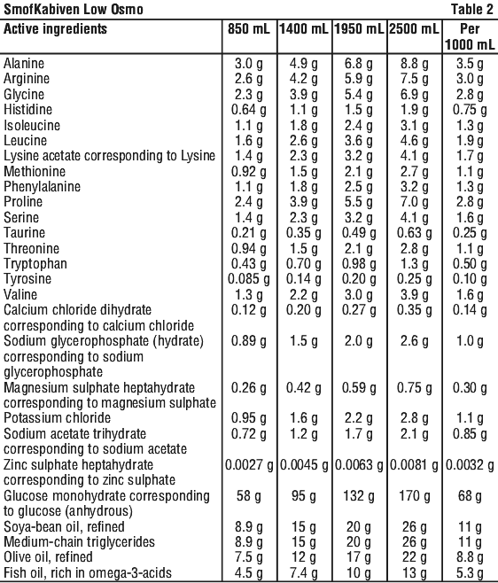 SmofKabiven Low Osmo contains the active ingredients: Alanine, Arginine, Glycine, Histidine, Isoleucine, Leucine, Lysine Acetate, Methionine, Phenylalanine, Proline, Serine, Taurine, Threonine, Tryptophan, Tyrosine, Valine, Calcium Chloride Dihydrate, Sodium Glycerophosphate Hydrate, Magnesium Sulfate Heptahydrate, Potassium Chloride, Sodium Acetate Trihydrate, Zinc Sulfate Heptahydrate, Glucose Monohydrate, Soya Oil, Medium- Chain Triglycerides, Olive Oil, and Fish Oil-rich in Omega-3 acids.