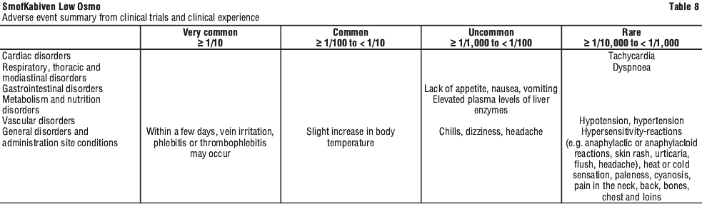 Adverse events in Table 8 are based on general assessment of trials and clinical experience of the product SmofKabiven.