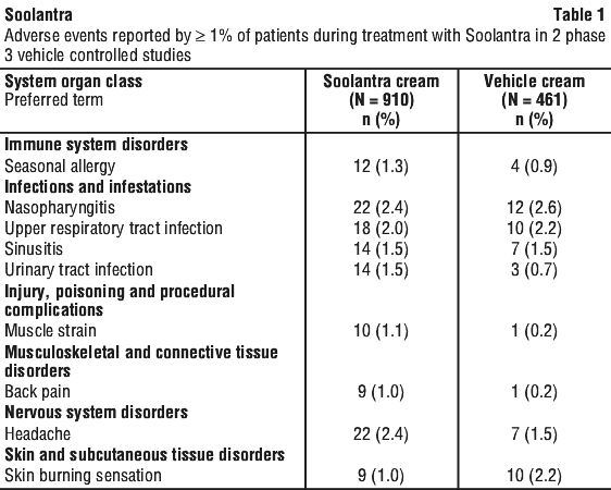 SOOLANTRA contains cetyl alcohol and stearyl alcohol which may cause local skin reactions (e.g. contact dermatitis), methyl hydroxybenzoate (E218) and propyl hydroxybenzoate (E217) which may cause allergic reactions (possibly delayed), and propylene glycol which may cause skin irritation.