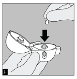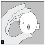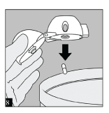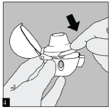 PRESS: Hold the HandiHaler with the mouthpiece upwards and press the piercing button completely in only once until it is flush against the base, and release.