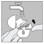 Then open the base by lifting the piercing button. Rinse the complete inhaler with warm water to remove any powder. Dry the HandiHaler thoroughly by tipping excess water out on a paper towel and air-dry afterwards, leaving the dust cap, mouthpiece and base open.