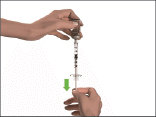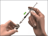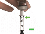 - Turn the vial and syringe upside down. With the needle in the solution, pull the plunger to withdraw the volume of the correct dose into the syringe.