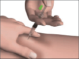 - Holding the syringe like a pencil or a dart, insert the needle into the raised skin so it is at an angle of between 45° and 90° to the skin surface.