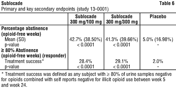 SUBLOCADE can cause withdrawal symptoms (dependence). Withdrawal signs and symptoms were not observed in the month following discontinuation of SUBLOCADE. Considering the long acting characteristic, any withdrawal signs and symptoms that may occur would be expected to be delayed.