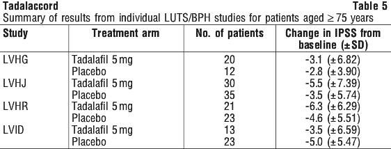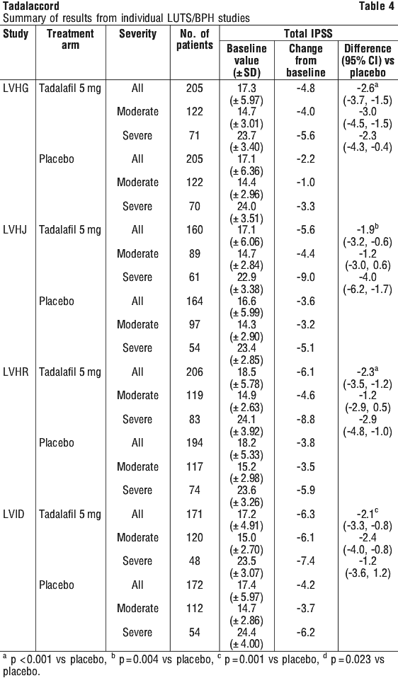 The improvement in total IPSS in the tadalafil group compared to placebo occurred as early as 1 week in the integrated data from Studies LVHJ and LVID.