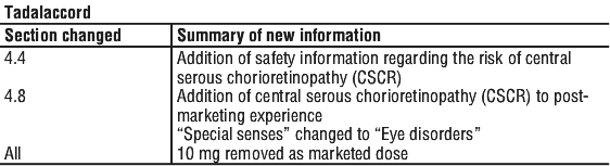 Sudden loss or decrease in hearing which may be accompanied by ringing in the ears and dizziness, loss of vision in one or both eyes and seizures have been reported in people taking TADALACCORD. It is not possible to determine whether these events are related directly to TADALACCORD, to other diseases or medications, to other factors, or to a combination of factors. If you experience these symptoms, stop taking TADALACCORD and contact a doctor immediately.