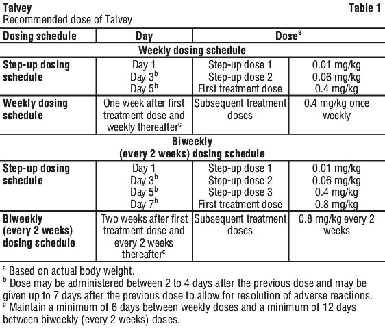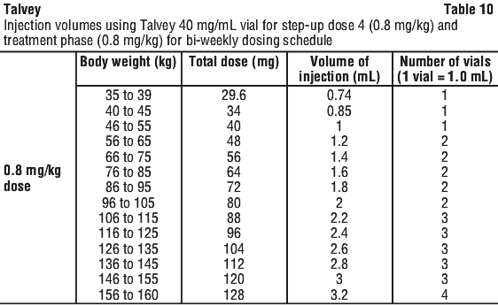 See Table 10 to determine total dose, injection volume, and number of vials required based on patient's actual body weight for the 0.8 mg/kg dose using Talvey 40 mg/mL vial.