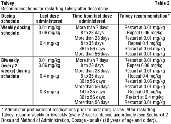 If a dose of Talvey is delayed, restart therapy based on the recommendations listed in Table 2 and resume weekly or biweekly (every 2 weeks) dosing accordingly (see Section 4.2 Dose and Method of Administration, Dosage - adults (18 years of age and older)). Administer pretreatment medications prior to restarting Talvey and monitor patients following administration of Talvey accordingly (see Section 4.2 Dose and Method of Administration, Pretreatment medications). See Table 2.