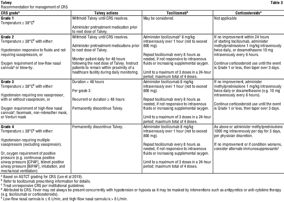 Identify CRS based on clinical presentation (see Section 4.4 Special Warnings and Precautions for Use, Cytokine release syndrome (CRS)). Evaluate and treat other causes of fever, hypoxia, and hypotension. If CRS is suspected, withhold Talvey until the adverse reaction resolves and manage according to the recommendations in Table 3. Administer supportive care for CRS which may include intensive care for severe or life-threatening CRS. Consider laboratory testing to monitor for disseminated intravascular coagulation (DIC), hematology parameters, as well as pulmonary, cardiac, renal, and hepatic function.