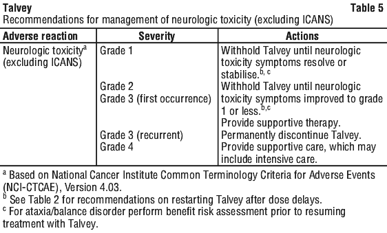 At the first sign of neurologic toxicity, including ICANS, withhold Talvey and consider neurology evaluation. Rule out other causes of neurologic symptoms. Provide supportive therapy, which may include intensive care, for severe or life-threatening ICANS (see Section 4.4 Special Warnings and Precautions for Use, Neurologic toxicities, including immune effector cell-associated neurotoxicity syndrome (ICANS). Management recommendations for ICANS and neurologic toxicity are summarised in Table 4 and Table 5.