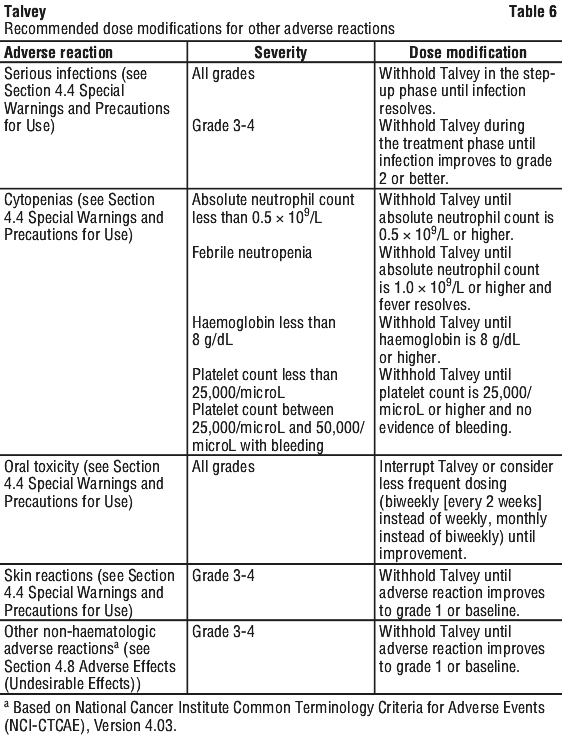 Dose delays may be required to manage toxicities related to Talvey (see Section 4.4 Special Warnings and Precautions for Use).