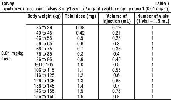 See Table 7 to determine total dose, injection volume, and number of vials required based on patient's actual body weight for the 0.01 mg/kg dose using Talvey 2 mg/mL vial.