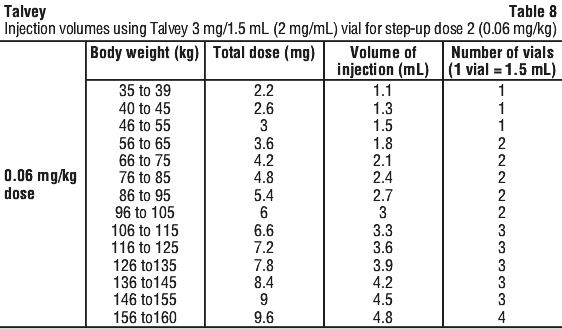 See Table 8 to determine total dose, injection volume, and number of vials required based on patient's actual body weight for the 0.06 mg/kg dose using Talvey 2 mg/mL vial.