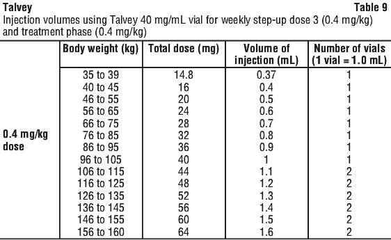 See Table 9 to determine total dose, injection volume, and number of vials required based on patient's actual body weight for the 0.4 mg/kg dose using Talvey 40 mg/mL vial.