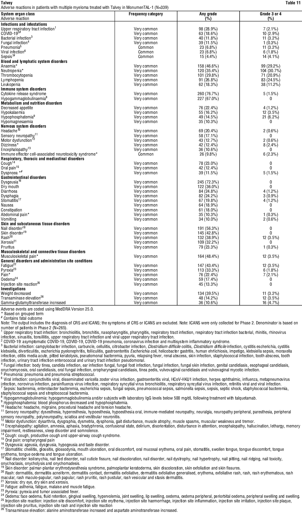 Table 11 summarises adverse reactions reported in patients who received Talvey. See Table 11.