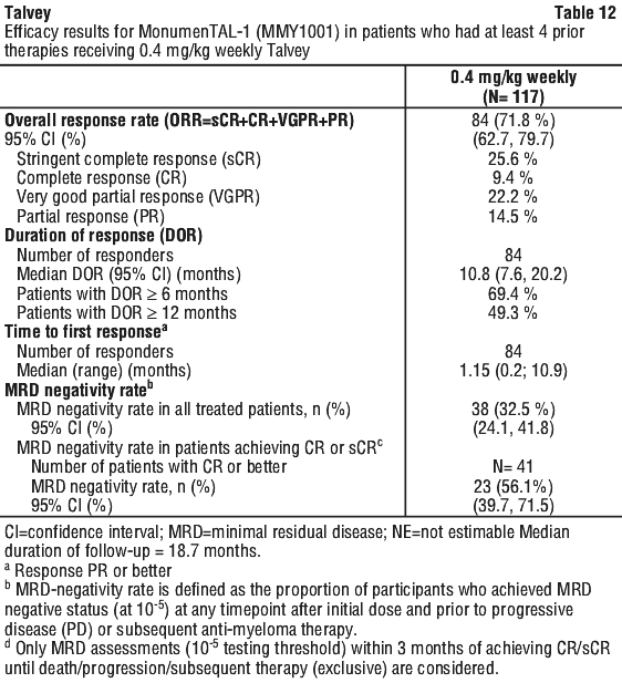 The efficacy results from 117 patients treated with Talvey 0.4 mg/kg weekly who were not exposed to prior T cell redirection therapy and who had received at least 4 prior therapies are presented in Table 12.
