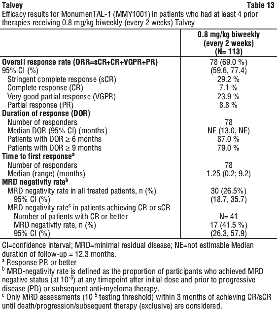 The efficacy of Talvey monotherapy was evaluated in patients with relapsed or refractory multiple myeloma in a single-arm, open-label, multicentre study, MonumenTAL-1 (MMY1001). The study included patients who had previously received at least three prior therapies, including a proteasome inhibitor, an immunomodulatory agent, and an anti-CD38 monoclonal antibody. The study included patients who received prior T cell redirection therapy (N=51). Patients received Talvey 0.4 mg/kg subcutaneously weekly, following two step-up doses (0.01 and 0.06 mg/kg) in the first week of therapy, or Talvey 0.8 mg/kg subcutaneously biweekly (every 2 weeks), following three step-up doses (0.01, 0.06 and 0.3 mg/kg), until disease progression or unacceptable toxicity. Patients were hospitalised for monitoring for at least 48 hours after each Talvey dose during the step-up phase.