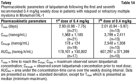 Pharmacokinetic parameters of talquetamab following the 1st and 7th recommended weekly dose of 0.4 mg/kg are shown in Table 14.