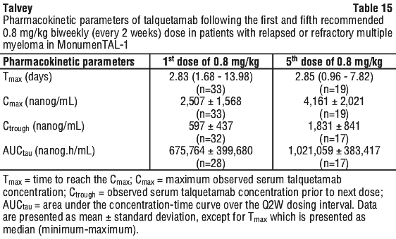 At 0.8 mg/kg biweekly (every 2 weeks) dose regimen, the median (range) Tmax of talquetamab after the 1st and 5th treatment doses were 3 (2 to 14) days and 3 (1 to 8) days, respectively.