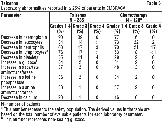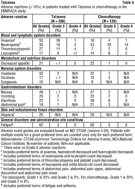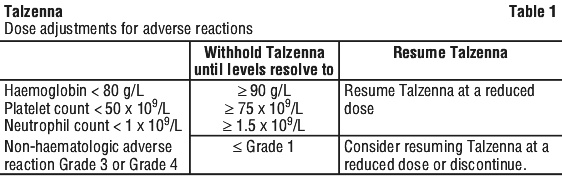 The following adverse reactions have been identified in < 10% of the 286 patients receiving Talzenna and are not included in Table 4: