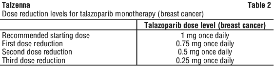 - The usual dose of TALZENNA for breast cancer is 1 mg taken once a day.