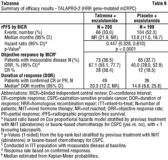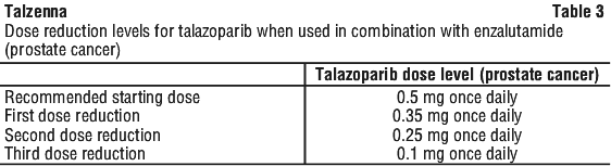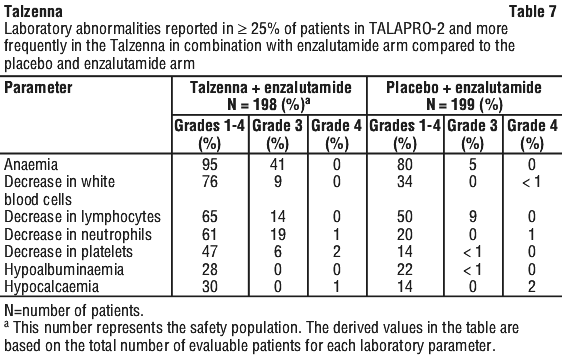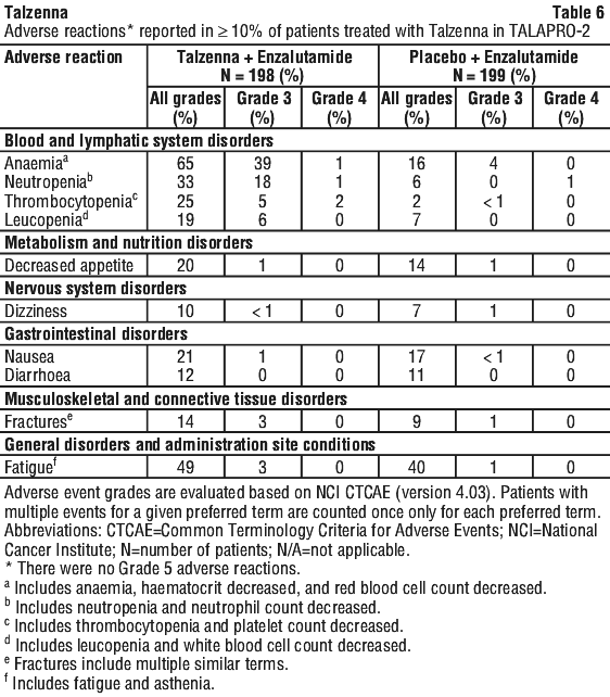 The following adverse reactions have been identified in < 10% of the 198 patients receiving Talzenna in combination with enzalutamide, and thus were not included in Table 6: