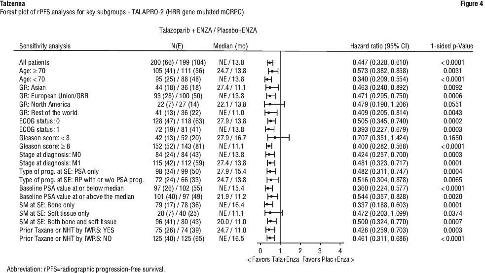 Prespecified subgroup rPFS analyses were performed based on prognostic factors and baseline characteristics to evaluate the internal consistency of the treatment effect. Consistent with the overall results, a reduction in the risk of disease progression or death in favour of talazoparib in combination with enzalutamide was observed in patient subgroups shown in Figure 4.