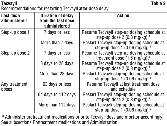 For guidance regarding restarting therapy with Tecvayli after dose delays, see Restarting Tecvayli after dose delays.