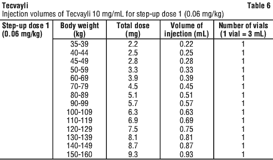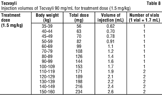Use Table 8 to determine total dose, injection volume and number of vials required based on patient's actual body weight for the treatment dose using Tecvayli 90 mg/mL.