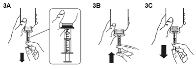 Fill the syringe with a small amount of suspension by pulling the plunger down (figure 3A), then push the piston upward in order to remove any possible bubble (figure 3B). Pull the piston down to the graduation mark corresponding to the quantity in milliliters (mL) prescribed by your doctor (figure 3C).