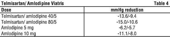 In a further multicentre, double-blind, active-controlled study, a total of 1097 patients with mild to severe hypertension (mean seated baseline systolic/ diastolic blood pressure 149.5/96.6 mmHg) who were not adequately controlled on amlodipine 5 mg received telmisartan/ amlodipine (40/5 mg or 80/5 mg) or amlodipine alone (5 mg or 10 mg). After 8 weeks of treatment, each of the combination was statistically significantly superior to both amlodipine monotherapy doses in reducing systolic and diastolic blood pressures (see Table 4):