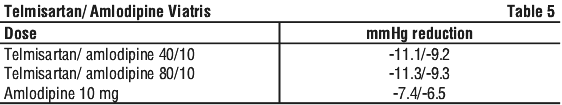 In another multicentre, double-blind, active-controlled study, a total of 947 patients with mild to severe hypertension (mean seated baseline systolic/ diastolic blood pressure 147.5/95.6 mmHg) who were not adequately controlled on amlodipine 10 mg received telmisartan/ amlodipine (40/10 mg or 80/10 mg) or amlodipine alone (10 mg). After 8 weeks, each of the combination treatments was statistically significantly superior to amlodipine monotherapy in reducing diastolic and systolic blood pressures (see Table 5):