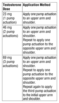 Each metered-dose pump contains 85.5 g gel and is capable of dispensing 56 metered individual doses of 1.15 g gel (1.25 mL), each dose containing 23 mg of testosterone.
