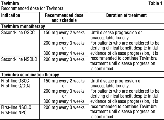 When Tevimbra is used in combination, see Table 1 for the full prescribing information of the combination therapy. When administering Tevimbra in combination with chemotherapy, administer Tevimbra before chemotherapy when both are given on the same day.