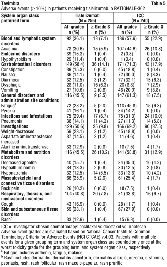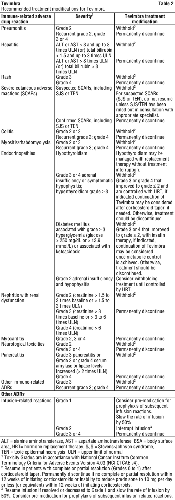 No dose reductions of Tevimbra as monotherapy or in combination therapy are recommended. Withhold or permanently discontinue Tevimbra depending on the severity of the adverse drug reaction (ADR).