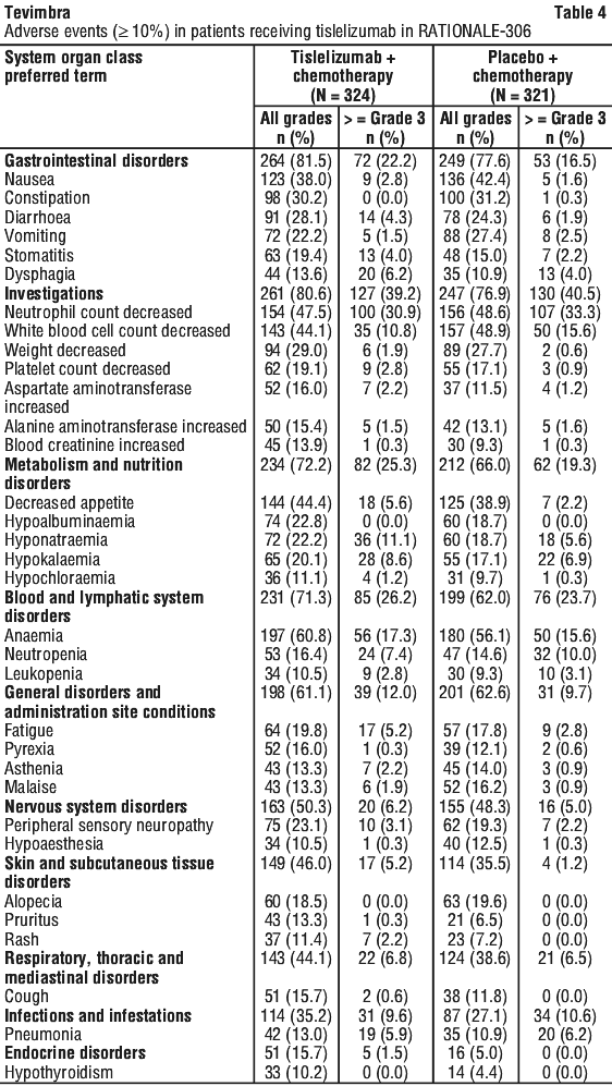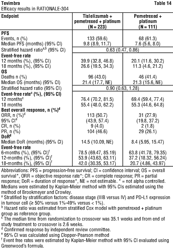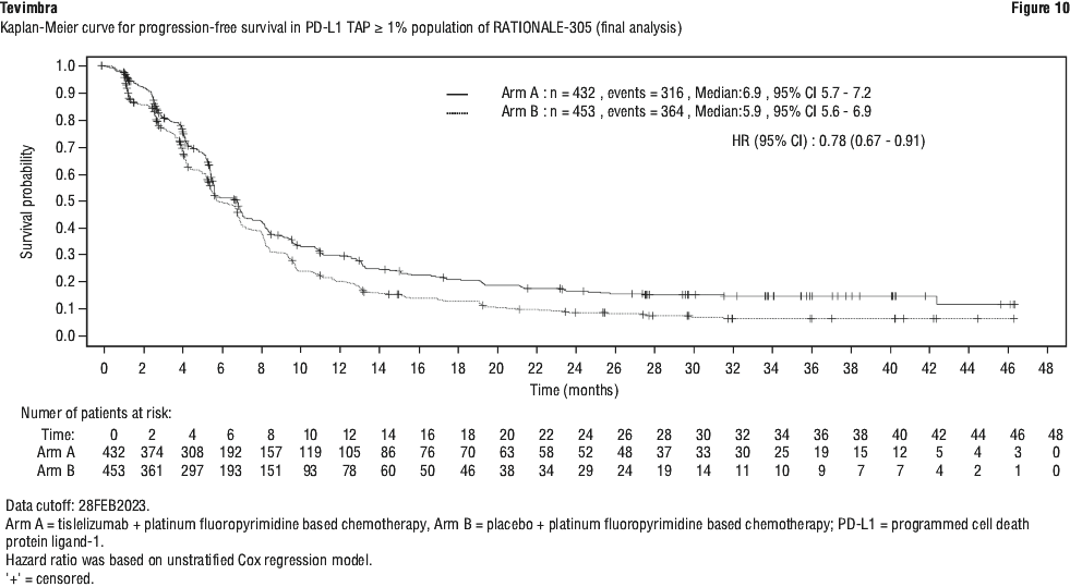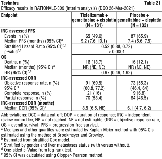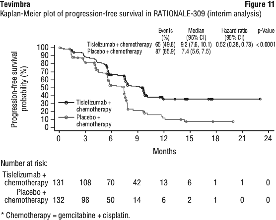 At interim analysis (data cut-off date 26-Mar-2021) with a minimum follow-up time of 10.0 months, RATIONALE-309 demonstrated a statistically significant improvement in PFS for patients randomised to the Tevimbra in combination with gemcitabine and cisplatin arm compared with the placebo plus gemcitabine and cisplatin arm.