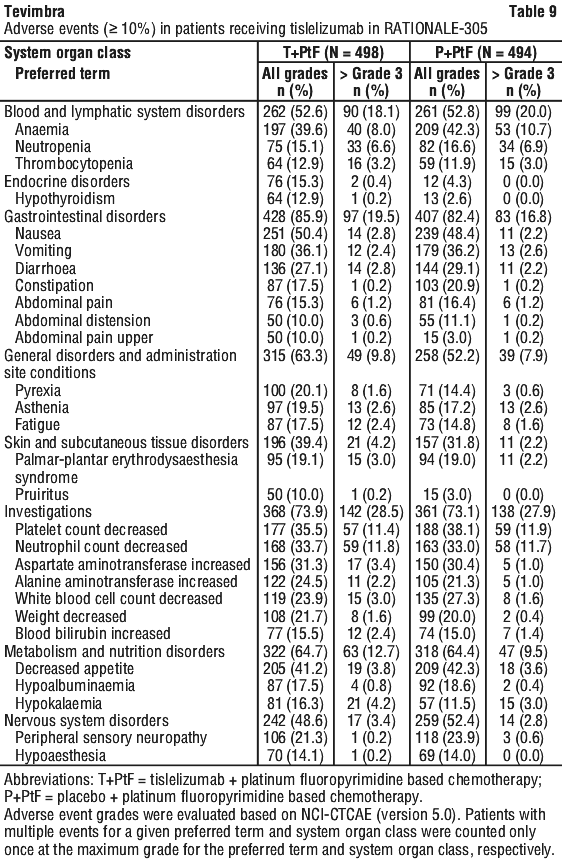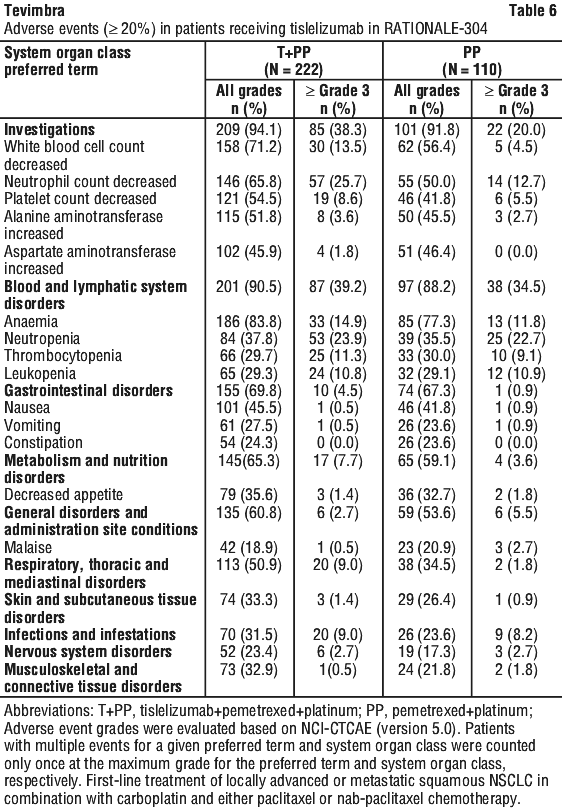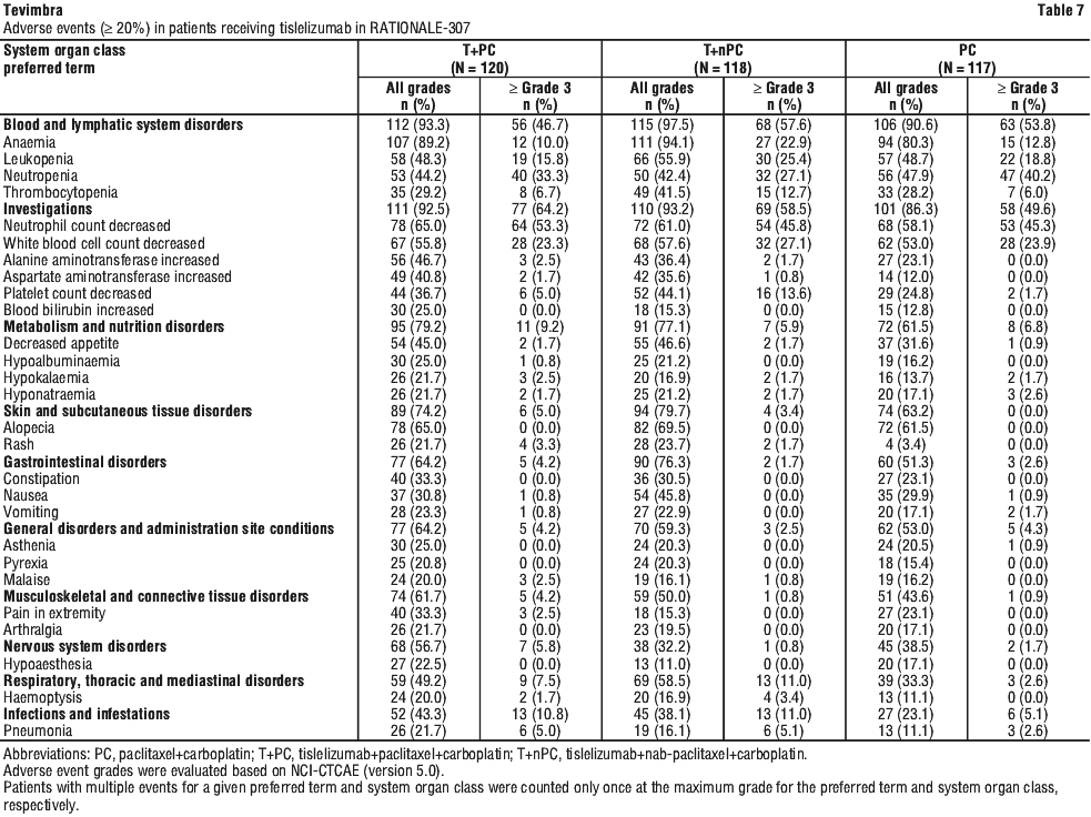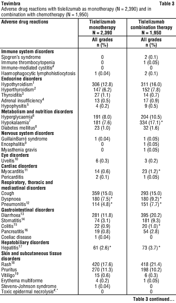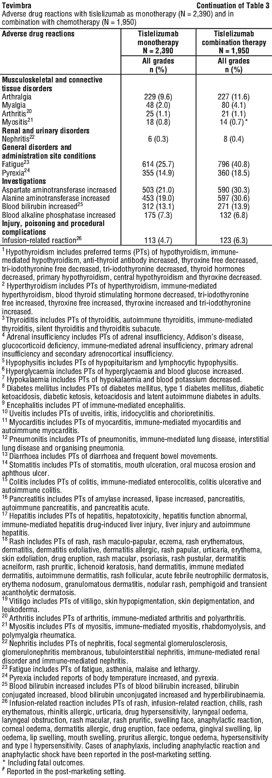 Other immune-related adverse reactions. Other clinically important immune-related adverse reactions were reported in patients treated with Tevimbra: myositis, myocarditis, arthritis, polymyalgia rheumatica, pericarditis, immune thrombocytopenia and Guillain-Barré syndrome (see Section 4.8 Adverse Effects (Undesirable Effects)).