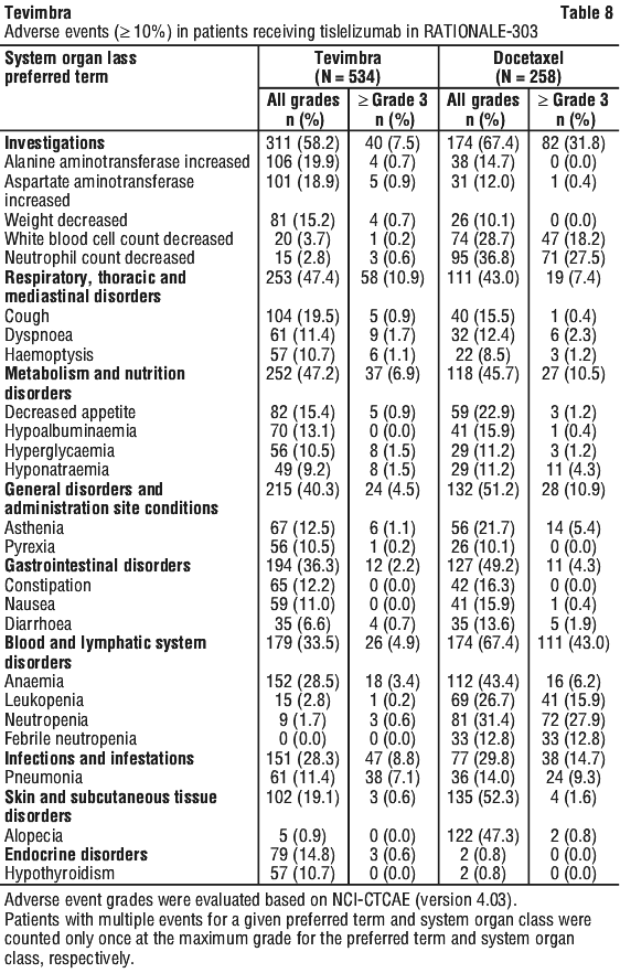 Severe infusion-related reactions (Grade 3 or higher) have been reported in patients receiving Tevimbra (see Section 4.8 Adverse Effects (Undesirable Effects)). Cases of anaphylaxis, including anaphylactic reaction and anaphylactic shock, have been reported in the post-marketing setting. Patients should be monitored for signs and symptoms of infusion-related reactions.
