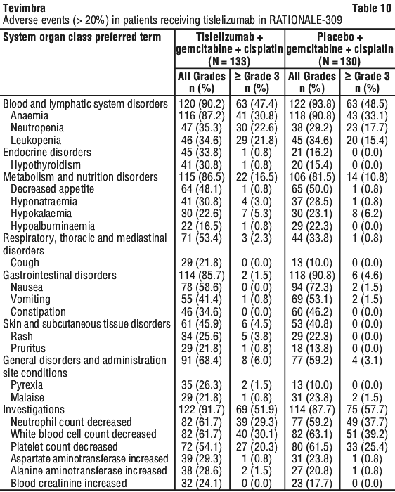 A total of 263 patients were randomised (1:1) to receive either Tevimbra 200 mg in combination with gemcitabine and cisplatin (N = 131) or placebo in combination with gemcitabine and cisplatin (N = 132).
