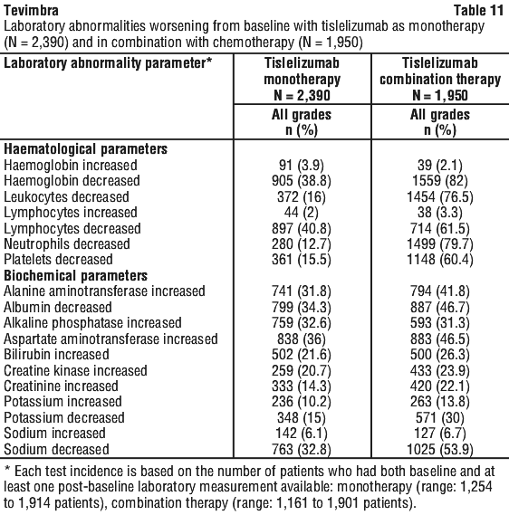 Haemophagocytic lymphohistiocytosis (HLH) has been reported in patients receiving tislelizumab (see Section 4.8 Adverse Effects (Undesirable Effects)). HLH is a life-threatening syndrome characterised by fever, skin rash, lymphadenopathy, hepato- and/or splenomegaly and cytopenias. Patients should be monitored for clinical signs and symptoms of HLH. For suspected HLH, tislelizumab must be interrupted. If HLH is confirmed, administration of tislelizumab should be discontinued.