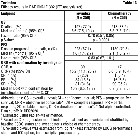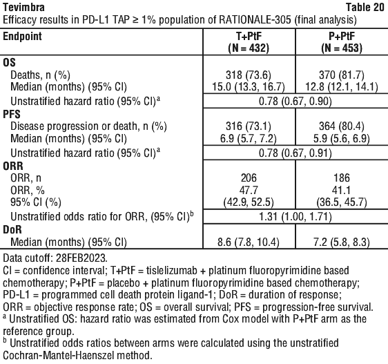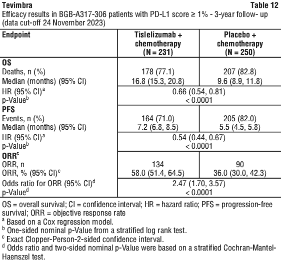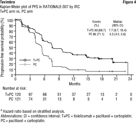 The study met its primary endpoint at the interim analysis (data cut-off date of 23-Jan-2020 and a median duration of study follow-up of 9.0 months) showing a statistically significant improvement in PFS with Tevimbra in combination with PP as compared with PP. The hazard ratio (HR) was 0.65 (95% CI: 0.47, 0.91; p = 0.0054) indicating a 35% reduction in the risk of experiencing disease progression or death, with a median PFS of 9.7 months with Tevimbra in combination with PP and 7.6 months with PP.