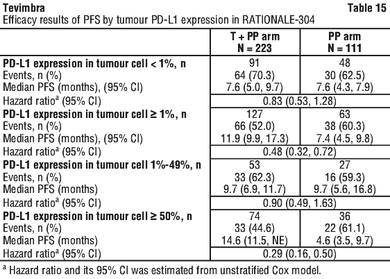 PD-L1 expression in tumor cell < 1%, 1%-49%, ≥ 50% of PFS were pre-specified PFS subgroup analyses, which were not alpha controlled; the results of PFS by tumor PD-L1 expression in the final analysis are shown in Table 15.