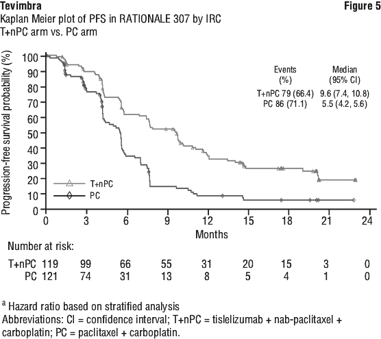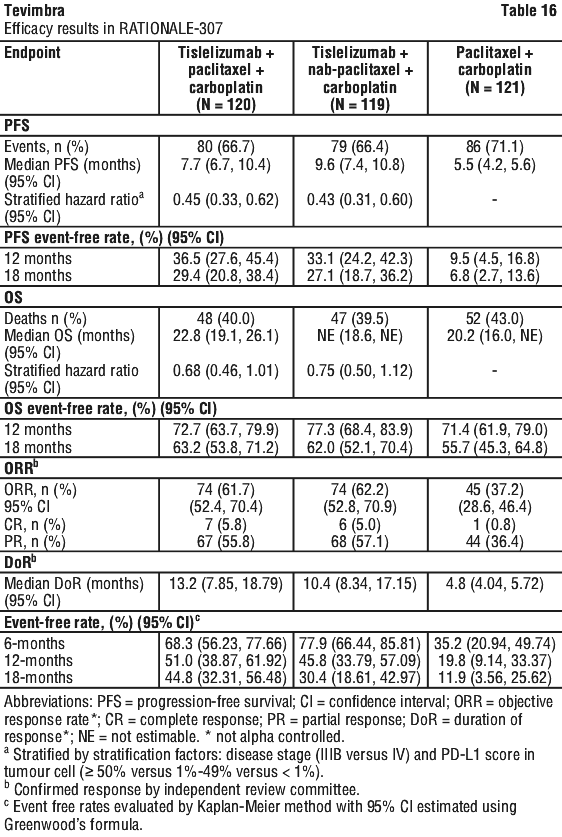 The efficacy of tislelizumab was evaluated in RATIONALE-307 (NCT03594747), a multicenter, randomized, open-label, phase 3 study, conducted in China, comparing the efficacy and safety of tislelizumab combined with carboplatin and paclitaxel or nab-paclitaxel versus carboplatin and paclitaxel alone as first-line treatment of locally advanced squamous NSCLC patients who were not candidates for surgical resection or platinum based chemoradiation or metastatic NSCLC patients.