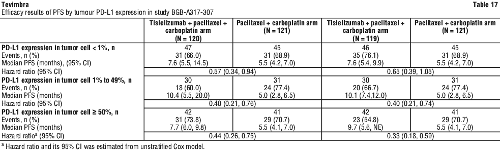 Efficacy results of PFS by tumour PD-L1 expression in pre-specified subgroup analyses for final analysis are shown in Table 17.