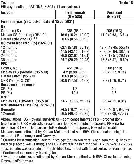 A total of 805 patients were randomized (2:1) ratio to receive tislelizumab 200 mg intravenously every 3 weeks (N = 535) or docetaxel 75 mg/m2 intravenously every 3 weeks (N = 270). Randomization was stratified by histology (squamous versus non-squamous), lines of therapy (second- versus third-line), and PD-L1 expression in tumour cells (TC) (≥ 25% versus < 25%). Administration of docetaxel and Tevimbra continued until disease progression, as assessed by investigator per RECIST v1.1, or unacceptable toxicity. PD-L1 expression was evaluated at a central laboratory using the VENTANA PD-L1 (SP263) assay that identified PD-L1 staining on tumour cells. Tumour assessments were conducted every 9 weeks for 52 weeks after randomization and continued every 12 weeks thereafter. Survival status was followed every 3 months after discontinuation of the study treatment.
