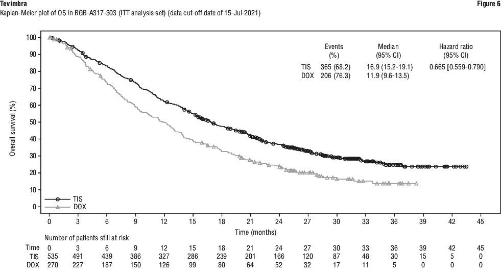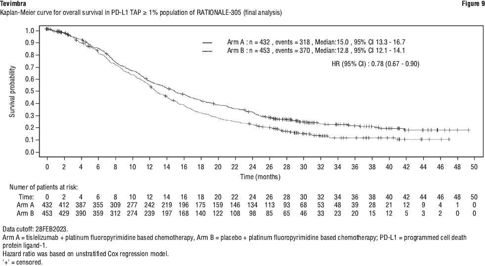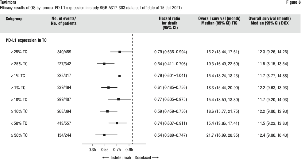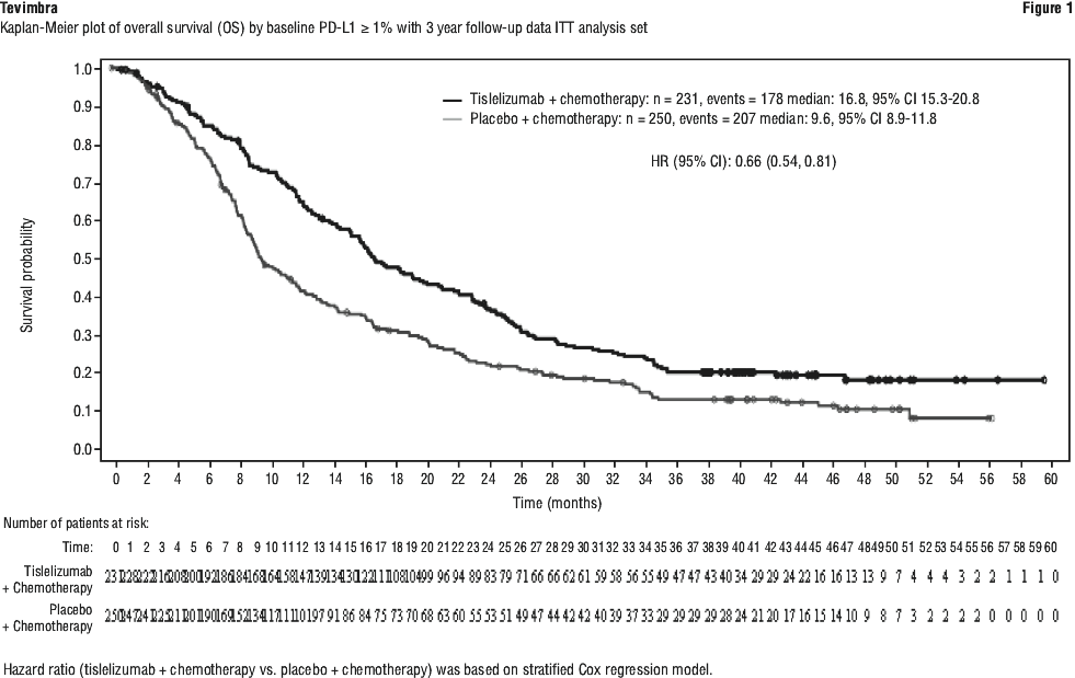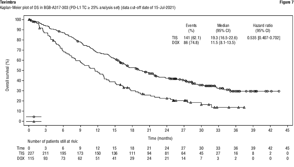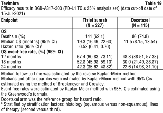 At the final analysis (data cut-off date of 15-Jul-2021 and a median duration of study follow up of 14.2 months) a statistically significant and clinically meaningful improvement in OS of tislelizumab compared with docetaxel was observed in the PD-L1 TC ≥ 25% analysis set, with a one-sided stratified p < 0.0001. Results favored treatment with Tevimbra, with a 47% relative risk reduction in death relative to docetaxel (stratified HR=0.53; 95% CI: 0.41, 0.70) in the PD-L1 TC ≥ 25% population, with median OS being 19.3 months for the tislelizumab arm and 11.5 months for the docetaxel arm. Efficacy results for the final analysis are shown in Table 18 (ITT analysis set) and Table 19 (PD-L1 TC ≥ 25% analysis set), Figure 6 (ITT analysis set) and Figure 7 (PD-L1 TC ≥ 25% analysis set).