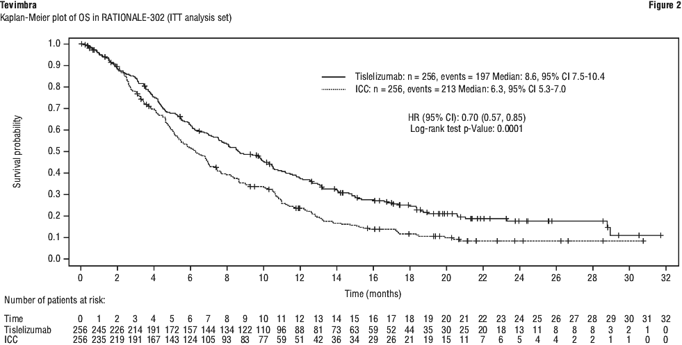 Randomisation was stratified by gender and metastatic status (with versus without liver metastases). Patients were randomised (1:1) to receive either Tevimbra 200 mg or placebo plus cisplatin 80 mg/m2 on Day 1 plus gemcitabine 1 g/m2 on Day 1 and Day 8 of each 21-day cycle for 4 to 6 cycles. Tevimbra or placebo was administered until disease progression or unacceptable toxicity. For patients in placebo plus gemcitabine and cisplatin arm, crossover to monotherapy Tevimbra was allowed after disease progression confirmed by the Independent Review Committee (IRC).