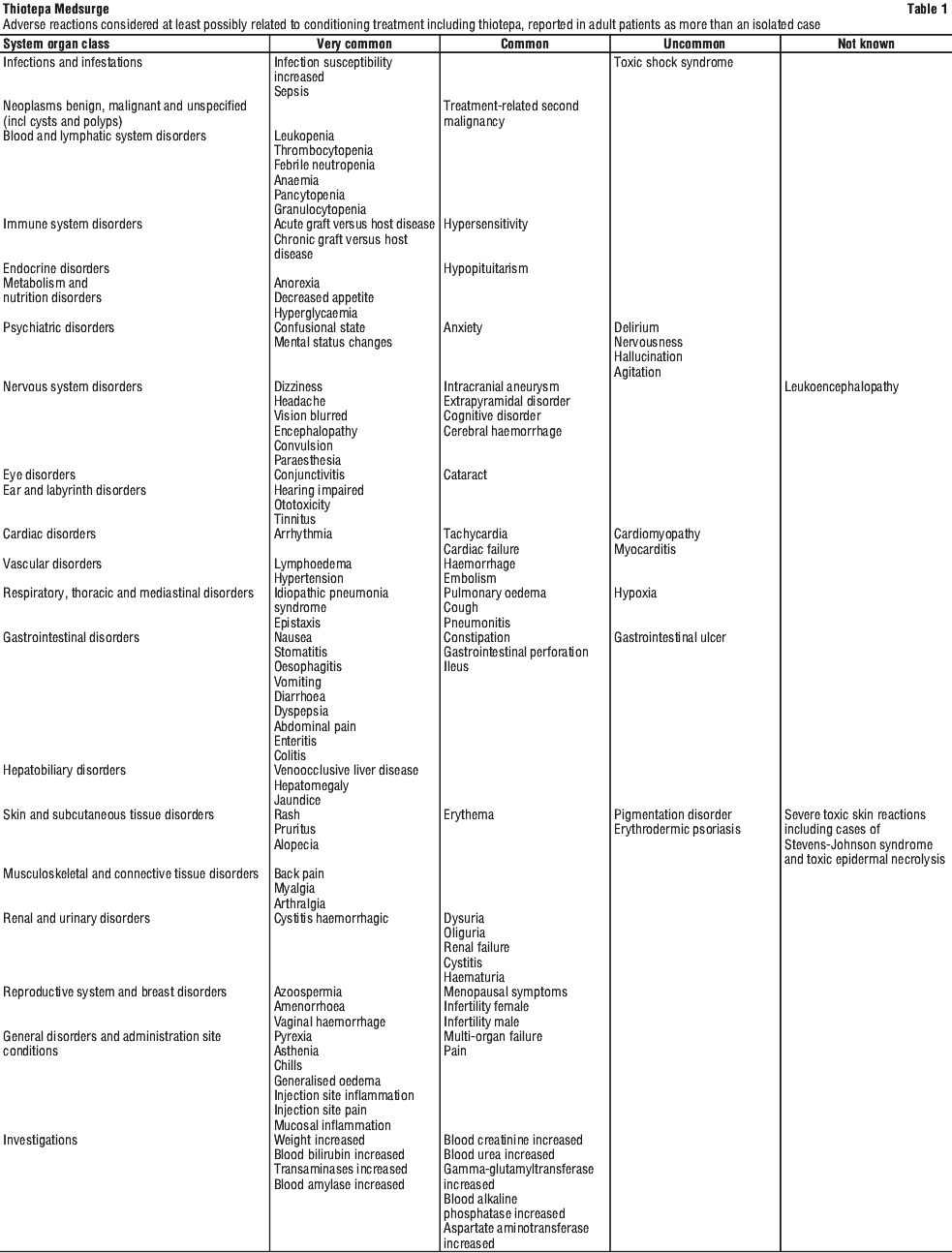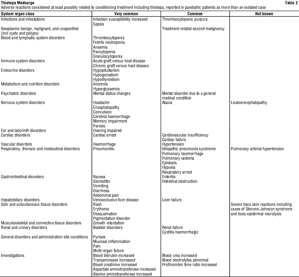 The adverse reactions considered at least possibly related to conditioning treatment including thiotepa, reported in paediatric patients as more than an isolated case, are listed below by system organ class and by frequency. Within each frequency grouping, undesirable effects are presented in order of decreasing seriousness. Frequencies are defined as: very common (≥ 1/10), common (≥ 1/100 to < 1/10), uncommon (≥ 1/1,000 to < 1/100), rare (≥ 1/10,000 to < 1/1,000) very rare (< 1/10,000), not known (cannot be estimated from the available data). See Table 2.